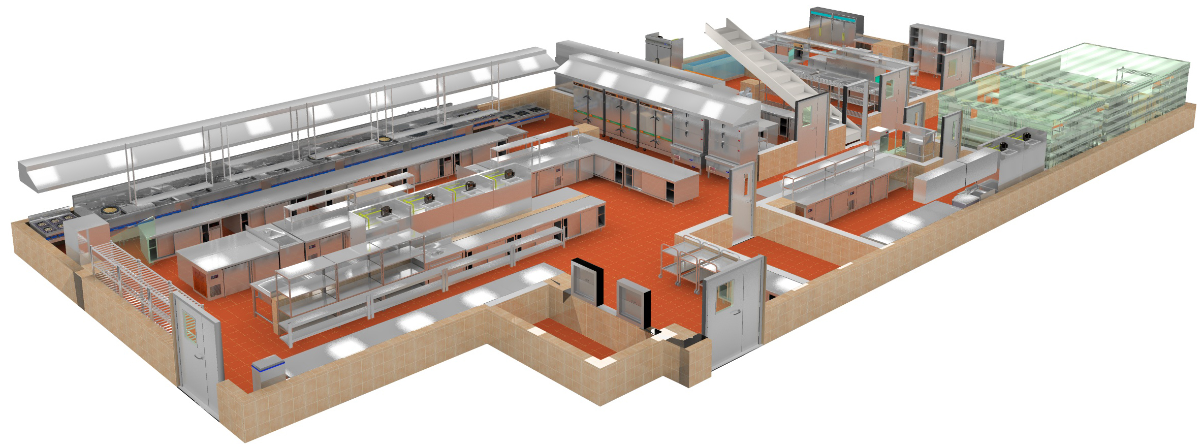2、从上表可见,配菜、烹调区所占面积最大,因为该区集中了大量的配份、打荷及加热烹调设备,且人流量大,活动范围广。加工区也占有较大比例。这里的加工,不仅承担初加工任务,原料切割、腌浆、干货涨发均在此完成,所以面积较大。冷菜制作区,主要是指制作烧烤、卤水,生产烹调冷菜的场所;而冷菜出品区,则是冷菜成品装盘出品的场所,无需太大。所有这些区域的面积比例都是相对的。不同地区,经营不同风味菜式,具体比例也会有所不同。