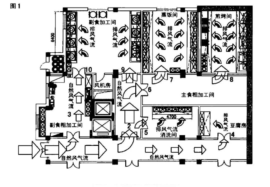 图1是一个学校食堂的半地下榴莲网站视频,售饭区和明档在二、三层,传菜收残全部用传菜梯,榴莲网站视频有一个出人口1号门。由于不补充新风,负压太大,主食加工的蒸饭间和煎烤间出人口7号、8号门关门后就很难打开,此时,下水道的污气、污水回流。需要关闭排烟风机,才能打开7. 8号门。9号、10号门关闭时,副食加工间下水道的污气、污水回流。由于负压作用,排烟管道漏出的油烟,从风机房被吸入副食加工间。打开7, 8号门时,6号门无法关门,对开门关闭一半时,风速达到8.5m/s 。当榴莲网站视频内部的出人门全部打开、排烟罩也同时开机时,在榴莲网站视频进户门1号门出现超常风速,风速达到7.5m/s,对开门关闭一半时,风速达到15m/s,相当于7级大风,人员出入困难。开门时灰尘、垃圾被吸人走廊。关上1号门,就很难打开。由于风速大,长期碰撞甚至使门损坏。