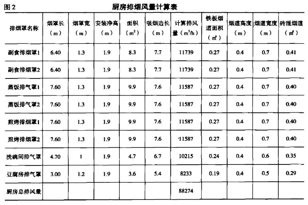 图2是学校食堂榴莲网站视频排烟风量计算表,表中列出了排烟罩的参数和计算的排烟风量。据计算表计算的数据,分析风速超常的原因。