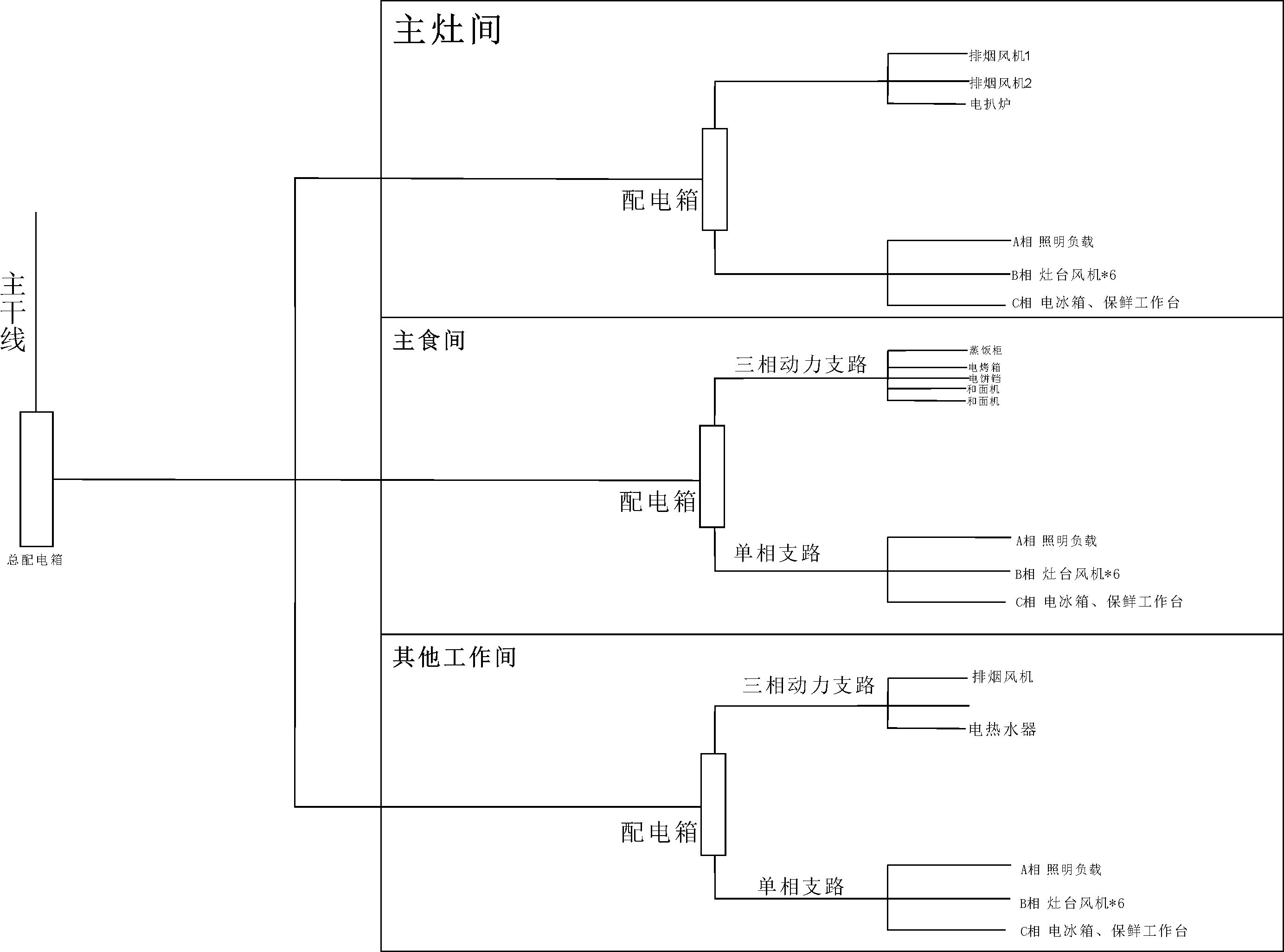 榴莲网站视频供电系统用电负荷分为单相负荷与三相负荷、单相负荷主要为照明电,单相插座以及其他额定电压为220V的电器用电。用电负荷的额定电压均为单相220V,均匀分布到A、B、C三相。这类负荷也叫作相负荷。一般分为两个独立的系统:照明系统和220V单相负荷动力系统。单相负荷动力系统通过单相插座向电冰柜、绞肉机、保鲜作台、灶台风机供220V动力电。380V三相负荷,分别供电到各个工作间额定电压为380V的动力支路,主要供蒸饭柜、传菜电梯、电热开水器、排灯风机等榴莲网站视频设备用电,线路不宜和其他独立控制的设备接在同一个分支回路。具体情况见下图:
