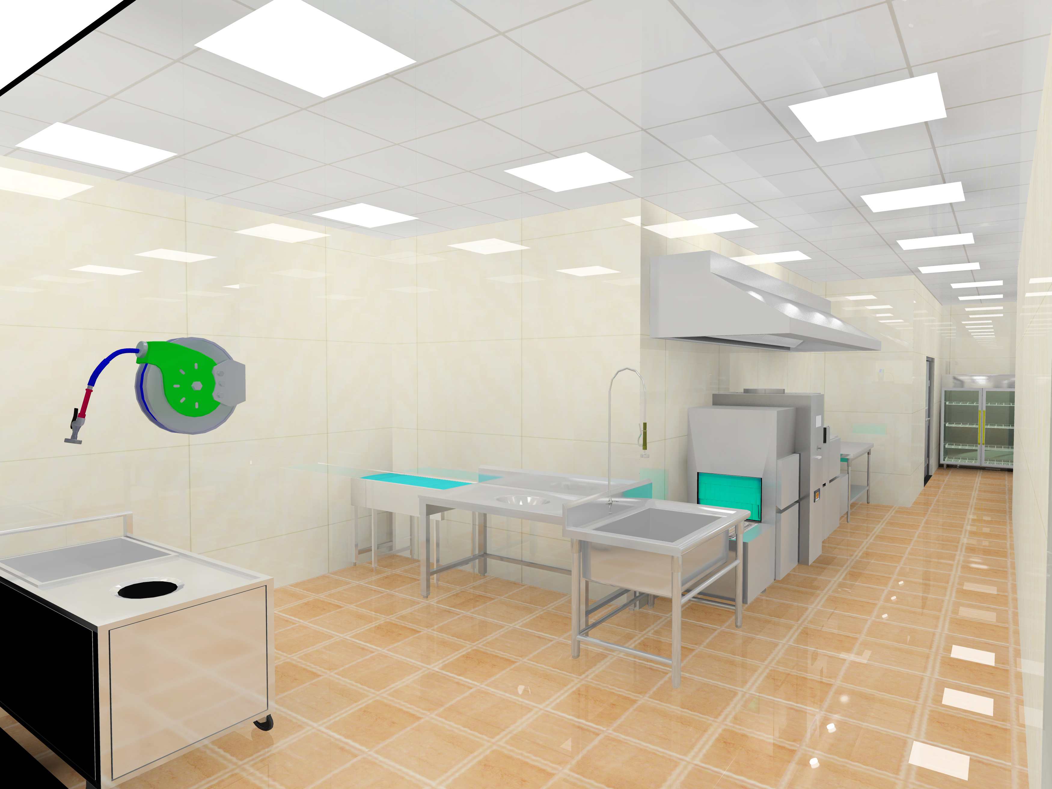 副食加工的流程:副食库→副食粗加工间→热菜间→凉菜间→备餐间→出餐口→餐厅。主食加工的流程:主食库→主食粗加工间→主食熟制加工间→备餐间→出餐口→餐厅。洗碗间要设在收残口,备餐间要设在出餐口,热菜间与凉菜间要紧靠备餐间,出菜顺畅方便。