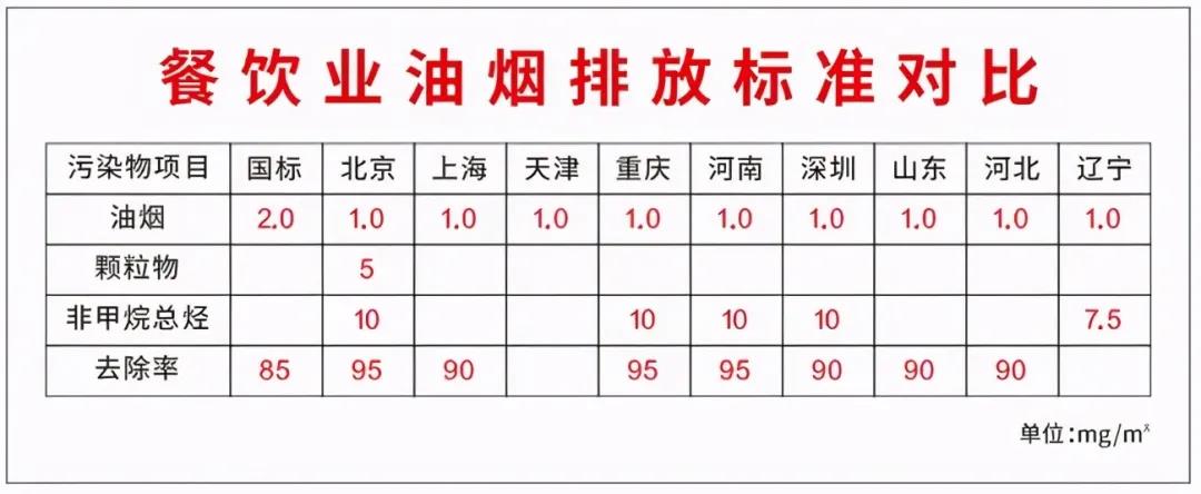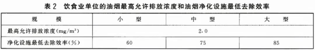 在我国对油烟排放有着严格的限制,国标《饮食业油烟排放标准(GB18483-2001)》规定,油烟排放浓度不得超过2.0mg/m3,相应净化系统的净化效率大型系统不得低于85%,中型系统不得低于75%,小型系统不得低于60%。
