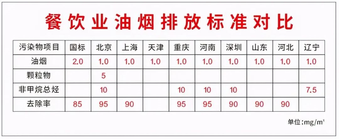 而国内一些地区油烟排放标准不允许排放浓度超过1.0mg/m3,北上广深天津、重庆、河南等地区,严格了一倍,安装的油烟净化器净化效率达到90%—95%以上。