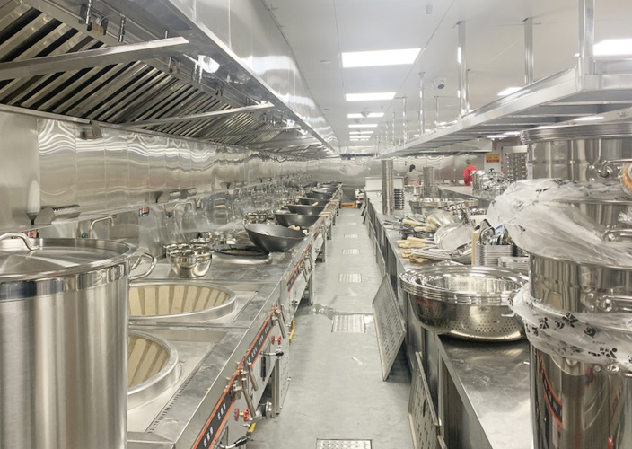 1、热厨间用来做菜:炒菜要用鼓风灶、蒸菜要用蒸柜、煲汤可以用低汤灶和煲仔炉,保温设备需要暖碟车、雪柜,排烟的设备要油网烟罩和油烟净化器、防火阀等一系列设备,另外就是操作台和水池、菜架了,有可能还要准备一个洗地龙头专门用来清洗地面。
