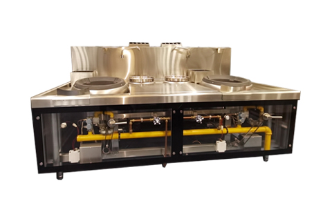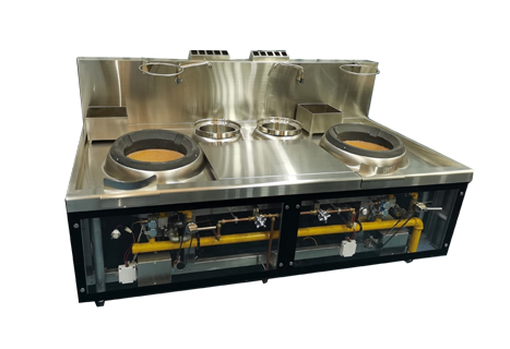 6、双连体比例阀,带稳压阀,风气联动,全铜管气制链接。加重加深尾撑,铜管上水,十字水阀,带笊篱架凉水盒,调味版,全钢把手。
