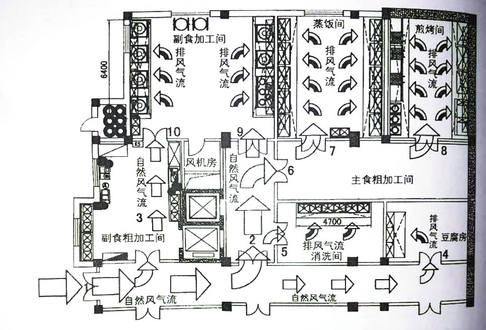 首先,图一是一个学校食堂的半地下榴莲网站视频,售饭区和明档在二、三层,传菜收残全部用传菜梯,榴莲网站视频有一个出入口1号门。由于不补充新风,负压太大,主食加工的蒸饭间和前烤间出入口7号、8号门关门后就很难打开,此时,下水道的污气、污水回流。